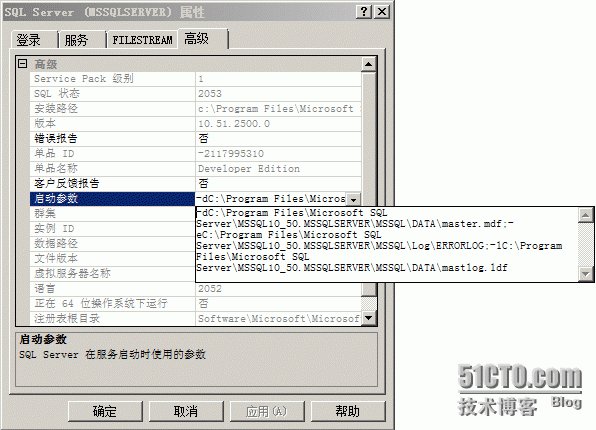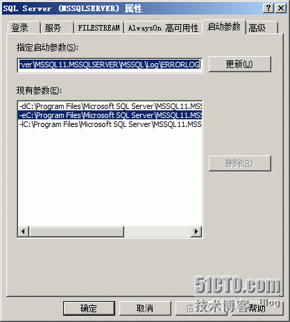 SQL Server 2012 新增了一个独立的“启动参数”选项卡,专门用于查看和修改启动参数。