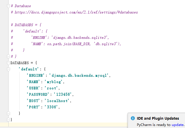 按照第三步的方法安装pymysql,更改Django项目中的配置文件settings.py: