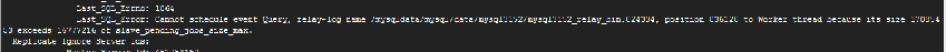 从库查看状态: mysql> show slavestatus\G Last_SQL_Errno: 1864 Last_SQL_Error: Cannot scheduleevent Update_rows, relay-log name ./HE1-relay-bin.000005, position 494 toWorker thread because its size 8200 exceeds 1024 ofslave_pending_jobs_size_max.