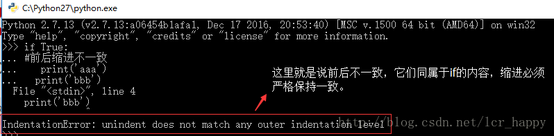 在Python里面对于缩进有严格的控制,同属于一个代码片的缩进必须一致,不然会报错。例如: