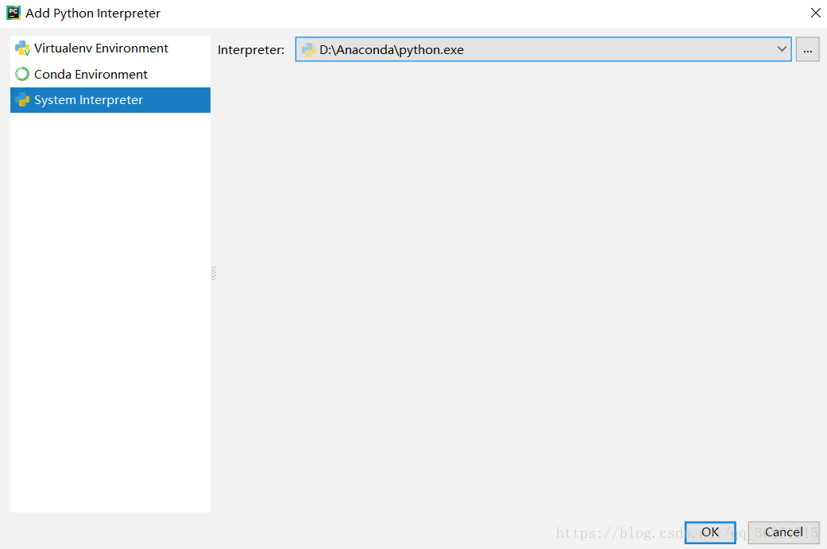 我用的是PyCharm,所以此处就用PyCharm做演示了,首先打开PyCharm,点击“File--settings--Project--Project Interpreter”旁边的设置齿轮图标,选中“Add”,然后就出现下面页面,选择“system Interpreter”,就能看到Anaconda环境自动导进来了,如果没有自动导进来,就手动找到Anaconda安装目录下python.exe;选中它回车,然后就大功告成了,以后的项目都会在Anaconda环境下运行了。