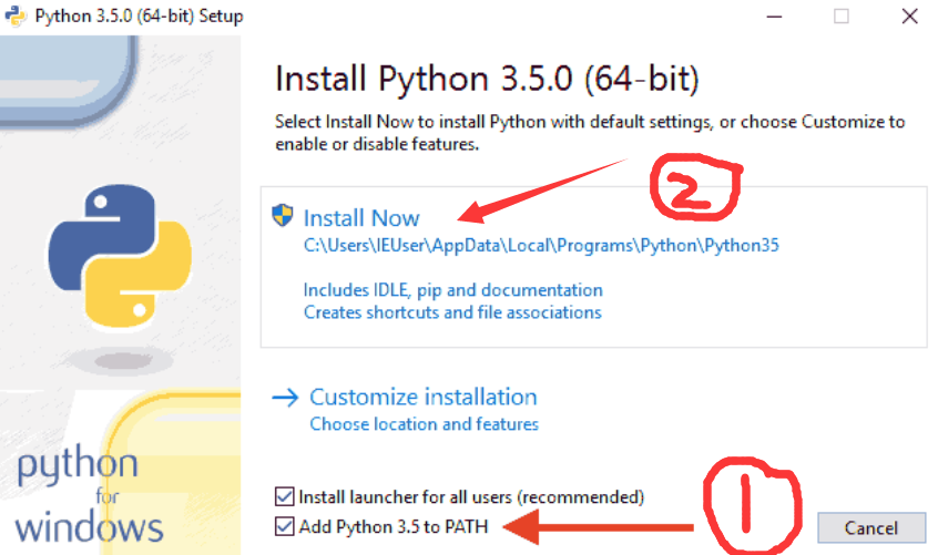 双击运行下载的exe文件,特别注意要勾选Add Python 3.5 to PATH,之后点击Install Now: