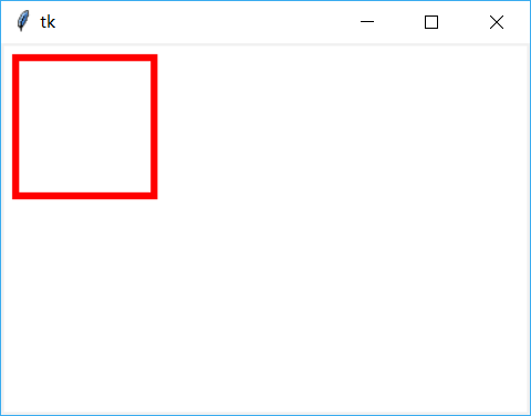 import tkinter as tk root = tk.Tk() # 创建一个 Canvas,设置其背景色为白色 cv = tk.Canvas(root, bg='white') # 创建一个矩形,坐标为(10,10,110,110) cv.create_rectangle(10, 10, 110, 110, outline='red', width=5) cv.pack() root.mainloop()