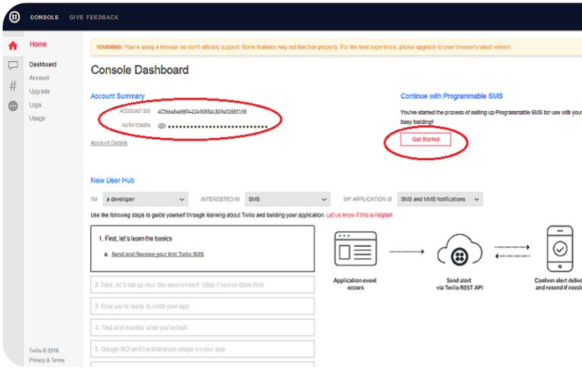 注册成功后,就来到了控制台面板。 记下ACCOUNT SID和AUTH TOKEN,程序里面要用到。 然后Get Started,会获得你的 twilio 电话号码。