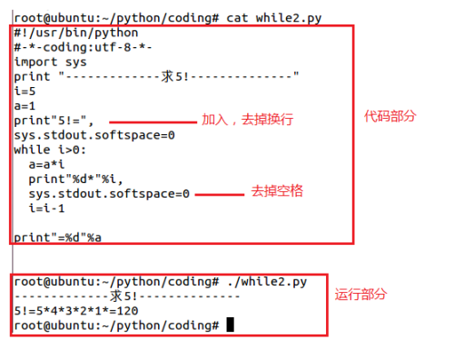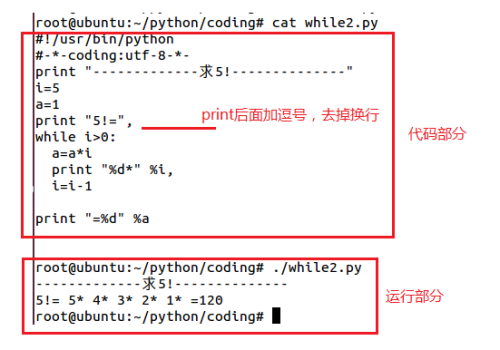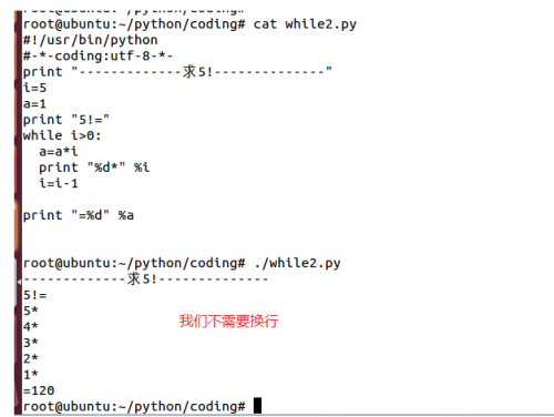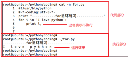 第5行的print i,逗号表示不换行,并且循环变量i会自动累加。