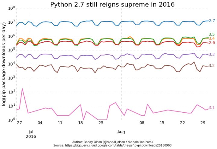 我们来看一下Python 2和Python 3的下载统计数据(Python 2.7 still reigns supreme in pip installs):