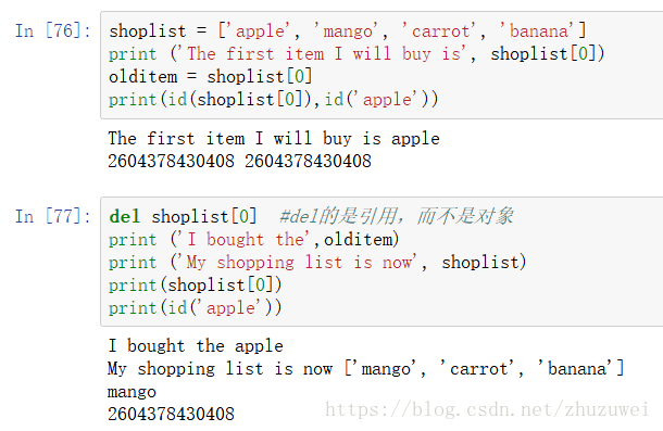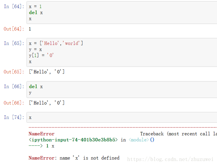 举个例子,一个数据(比如例子中的列表),就是一个盒子,我们把它赋给一个变量x,就是好像把一个标签x贴到了盒子上,然后又贴上了y,用它们来代表这个数据,但是用del删除这个变量x就像是把标有x的标签给撕了,剩下了y的标签。
